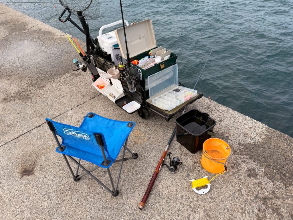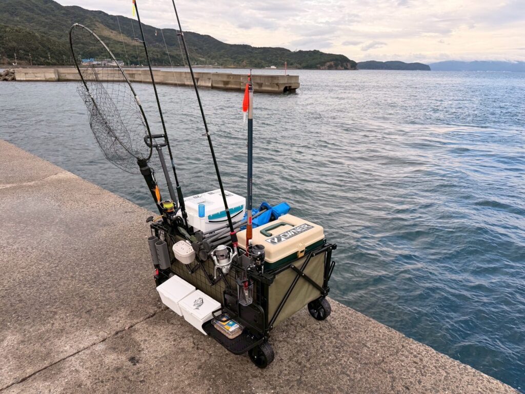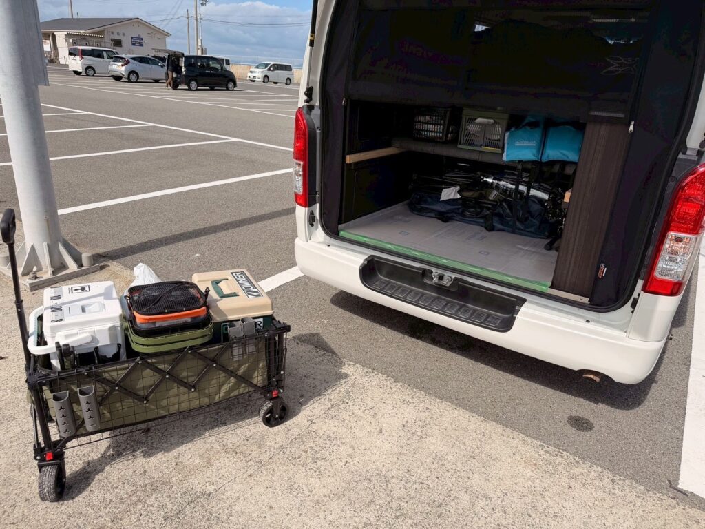 車横づけ出来るとわ言え、漁港内で釣りポイントを移動する際に釣り道具を片付けて移動するのが面倒に感じ釣り道具をキャリーワゴンにまとめられる様にカスタムしてみた所、移動や車への出し入れがとても楽になりました。