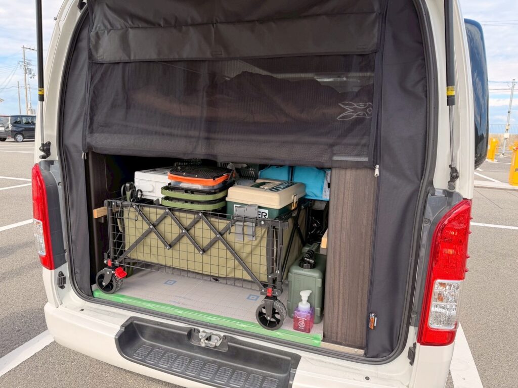 波の音を聞きながらハイエースのベッドモードで車中泊。