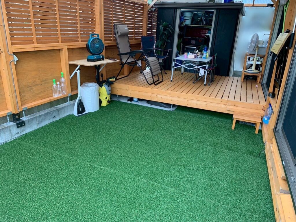 人工芝のお陰でウッドデッキ同様に素足で過ごせるアウトドアリビングとなり快適性が向上しました!