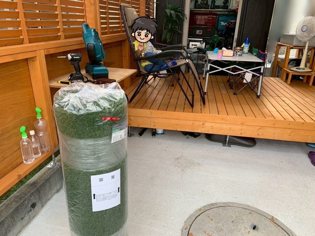 まずはコンクリートのままだと味気ないので人工芝を敷いて緑を作っていきます。