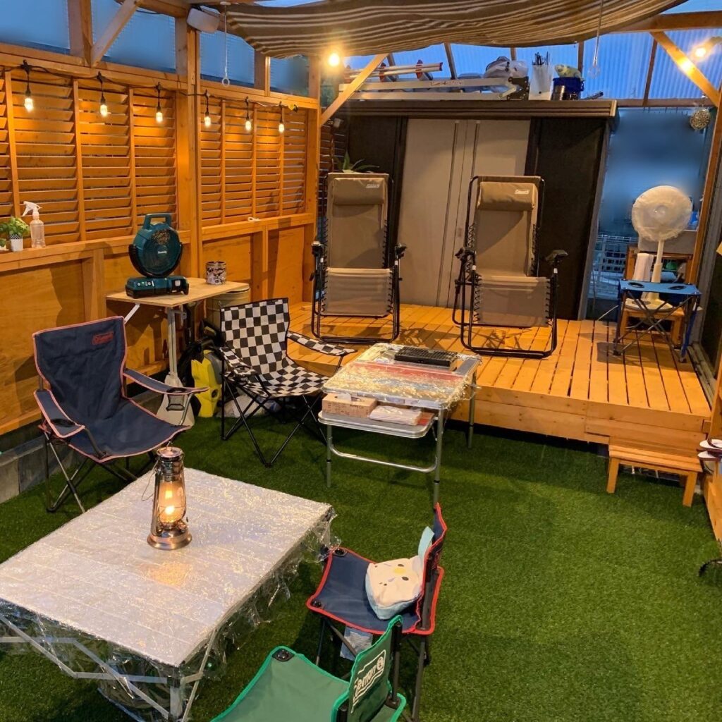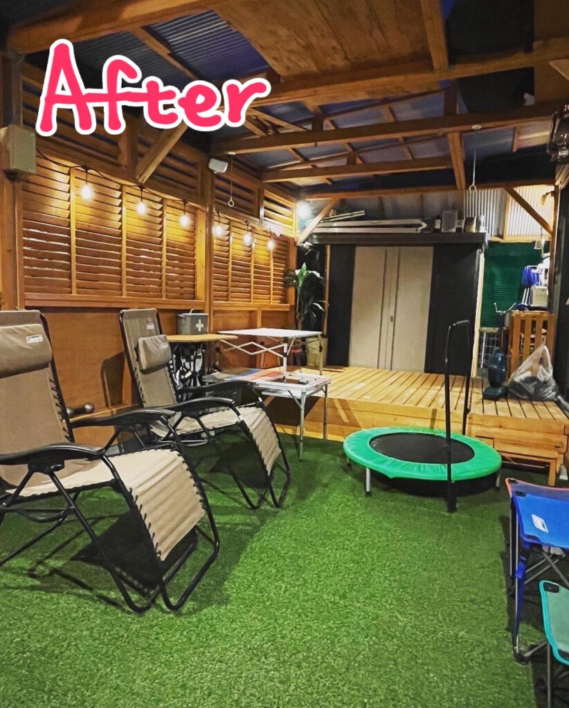 照明器具の設置と人工芝を敷いてアウトドア空間を演出