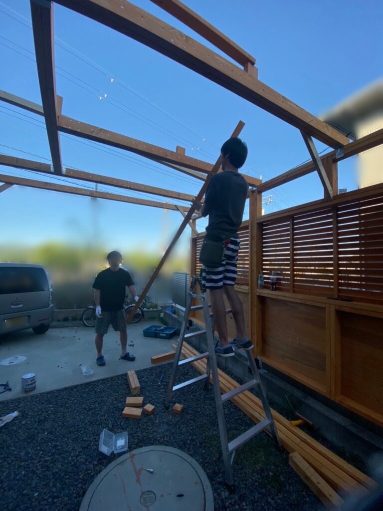 壁の骨組みには2×4材を使用して目立たない下部は構造用合板張りにして、上部にはお洒落な感じを出す為にラティスフェンスを採用しました。このラティスフェンスは簡単に取り外せるようになっており台風が来た際や古くなって交換が必要になった時に対応しやすいように考えました。