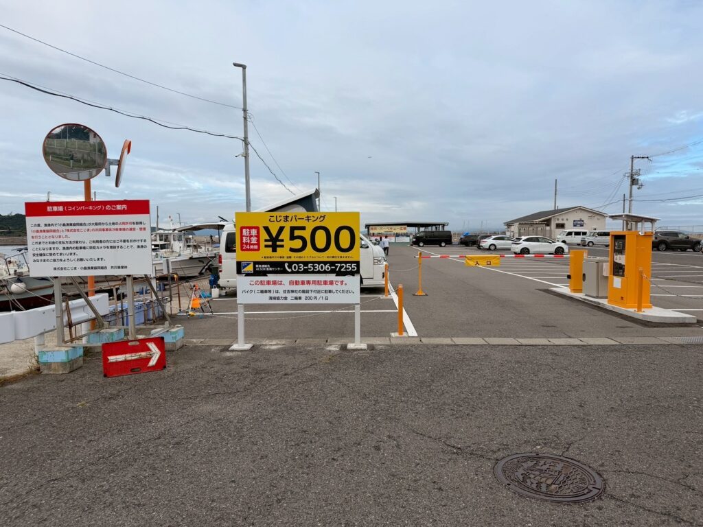 ナビで「小島漁港」と検索すればスムーズに到着でき、駐車場も広々としており、**1日500円(前払い制)**で利用可能です。